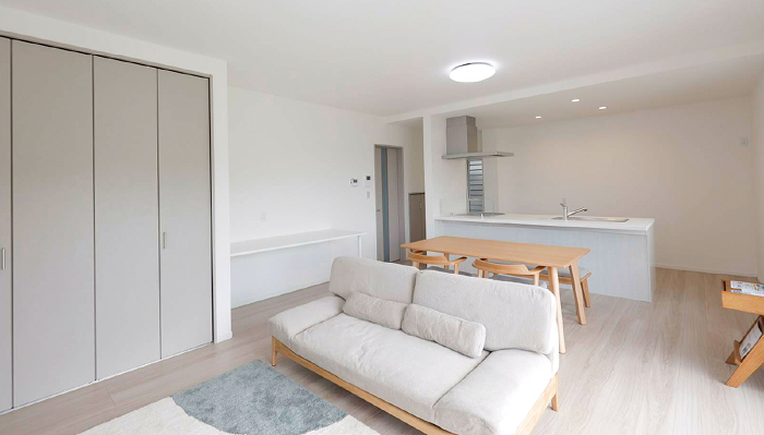 広々とした約23帖のLDK空間。キッチンの吊戸棚を無くし開放的にしています。